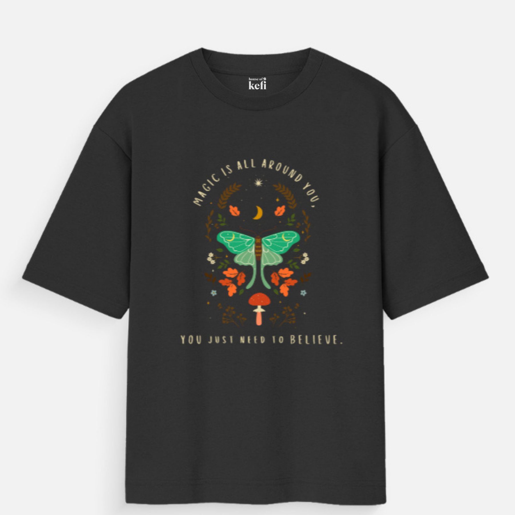 Magic isn’t some faraway thing. It’s everywhere—mushrooms in the forest, a moth under the moon, wildflowers in a crack of pavement. This tee is your gentle reminder to stay enchanted. With celestial touches, earthy florals, and the words “Magic is all around you, you just need to believe,” it’s designed for dreamers who still see the world with soft eyes.