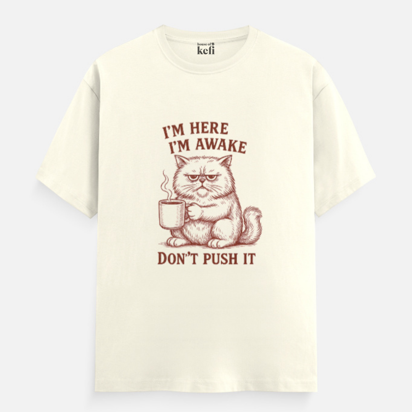 For mornings when “awake” is the best you can offer. This funny coffee cat t-shirt perfectly captures that pre-caffeine mood — featuring a gloriously unimpressed feline clutching a mug and warning, “I’m here, I’m awake, don’t push it.” Perfect for cat lovers, coffee addicts, and anyone who needs their personal space until cup number two.