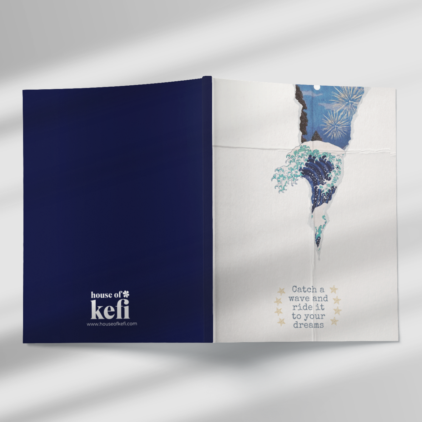 You’ve got a brain full of big ideas and a spirit that won’t stay still; Tidal Thoughts is here to ride the wave with you. Featuring a ripped-paper illusion revealing a crashing wave beneath fireworks and moonlight, this notebook captures the thrill of chasing what sets your soul on fire. Perfect for surfers of inspiration, night thinkers, and dreamers who don’t wait for calm seas.